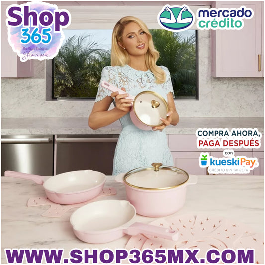 Paris Hilton Juego de utensilios de cocina antiadherentes de aluminio fundido con perillas de tapa en forma de corazón, rosa