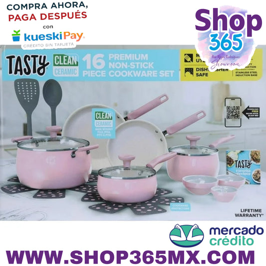 Tasty Clean Ceramic Juego de utensilios de cocina de aluminio antiadherentes de 16 piezas, color rosa