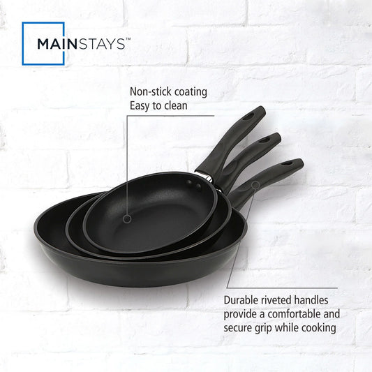 Mainstays Juego de Sartenes de Aluminio Antiadherente de 3 Piezas, Acabado Negro, Juego de 3