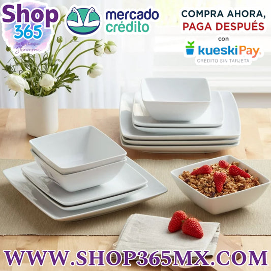 Better Homes & Gardens- Conjunto de Vajilla de Porcelana Cuadrada Blanca de 12 Piezas