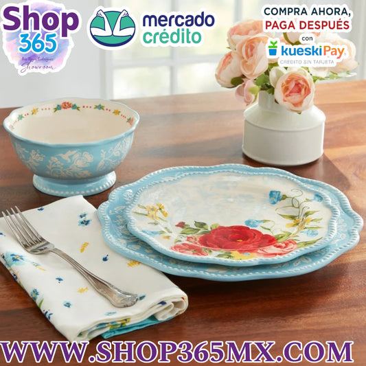The Pioneer Woman Dulce Rosa Luz Azul Gres 12 Piezas Vajilla Conjunto