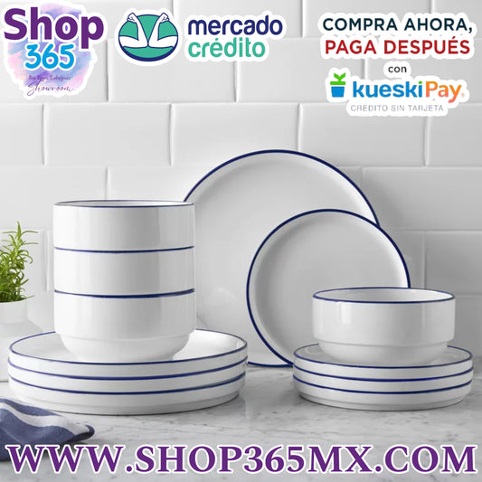 Mainstays Juego de Vajilla de 12 Piezas con Gres de Borde Azul