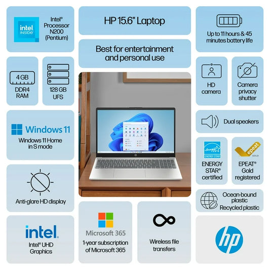 Portátil HP de 15,6", procesador Intel N200, 4 GB de RAM, 128 GB UFS, azul, Windows 11 Home en modo S, 15-fd0081wm