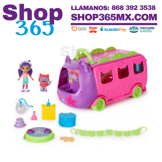 Gabby's Dollhouse Juego de Vehículo Transformable de Autobús para Fiestas de Celebración con Figuras de Juguete de Gabby y DJ Catnip