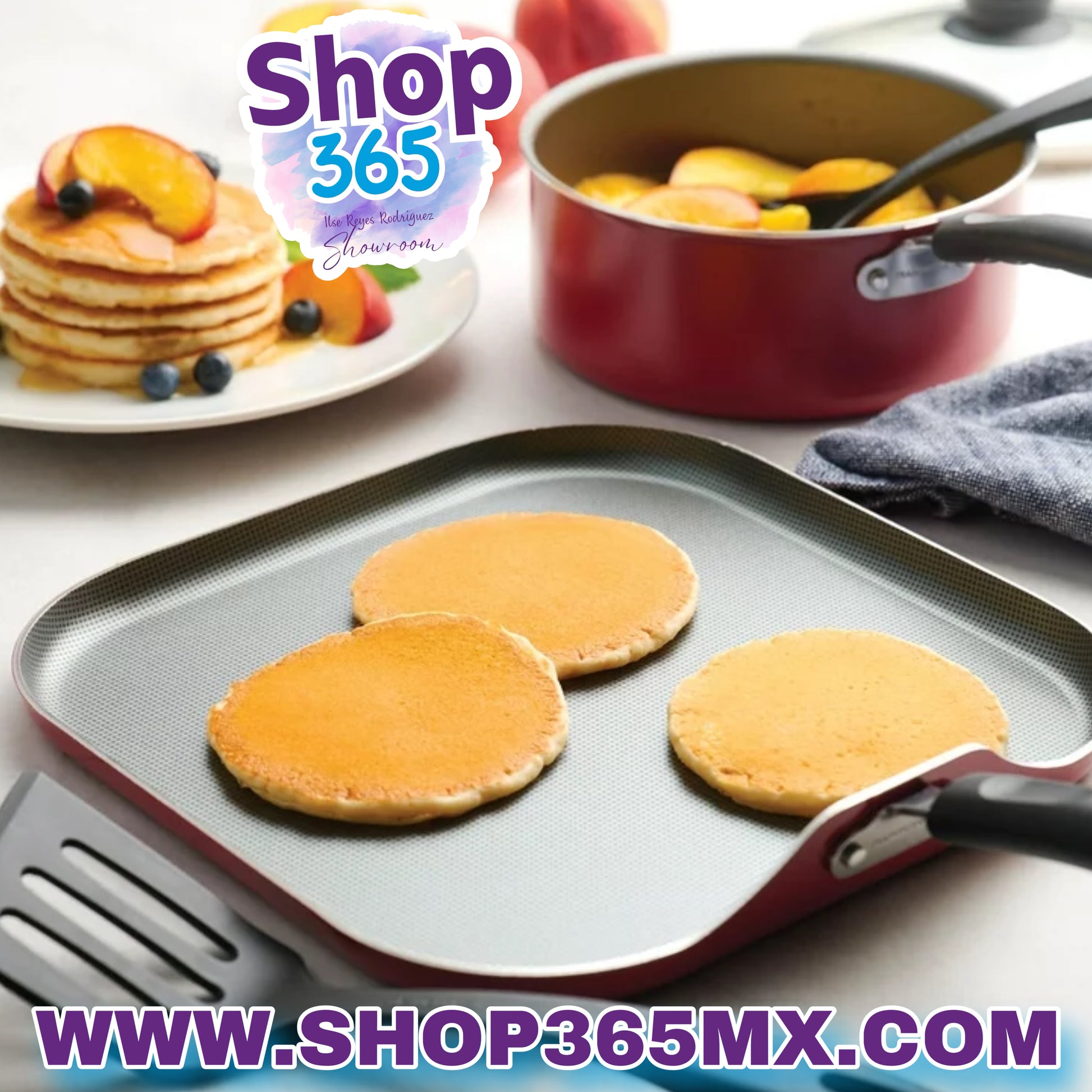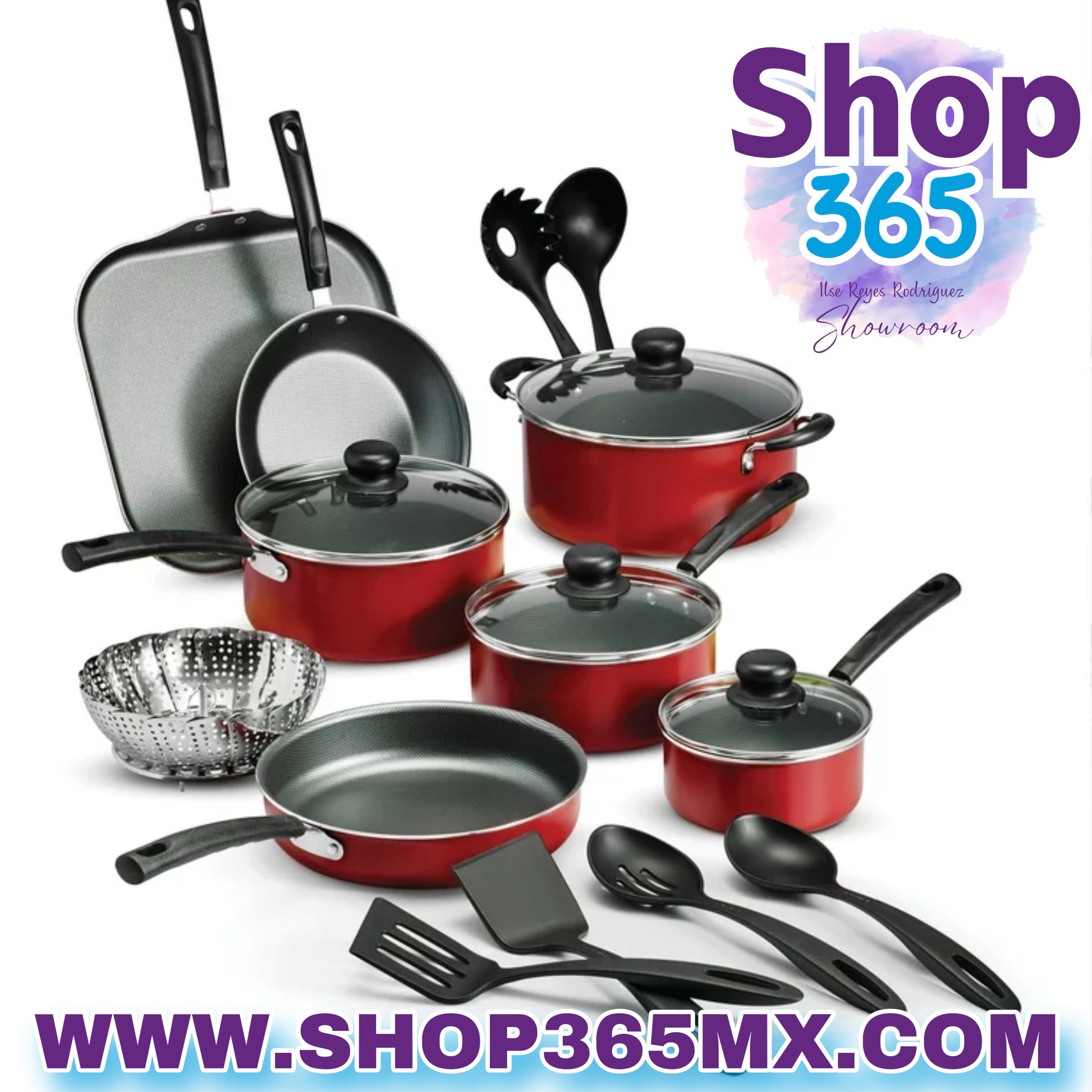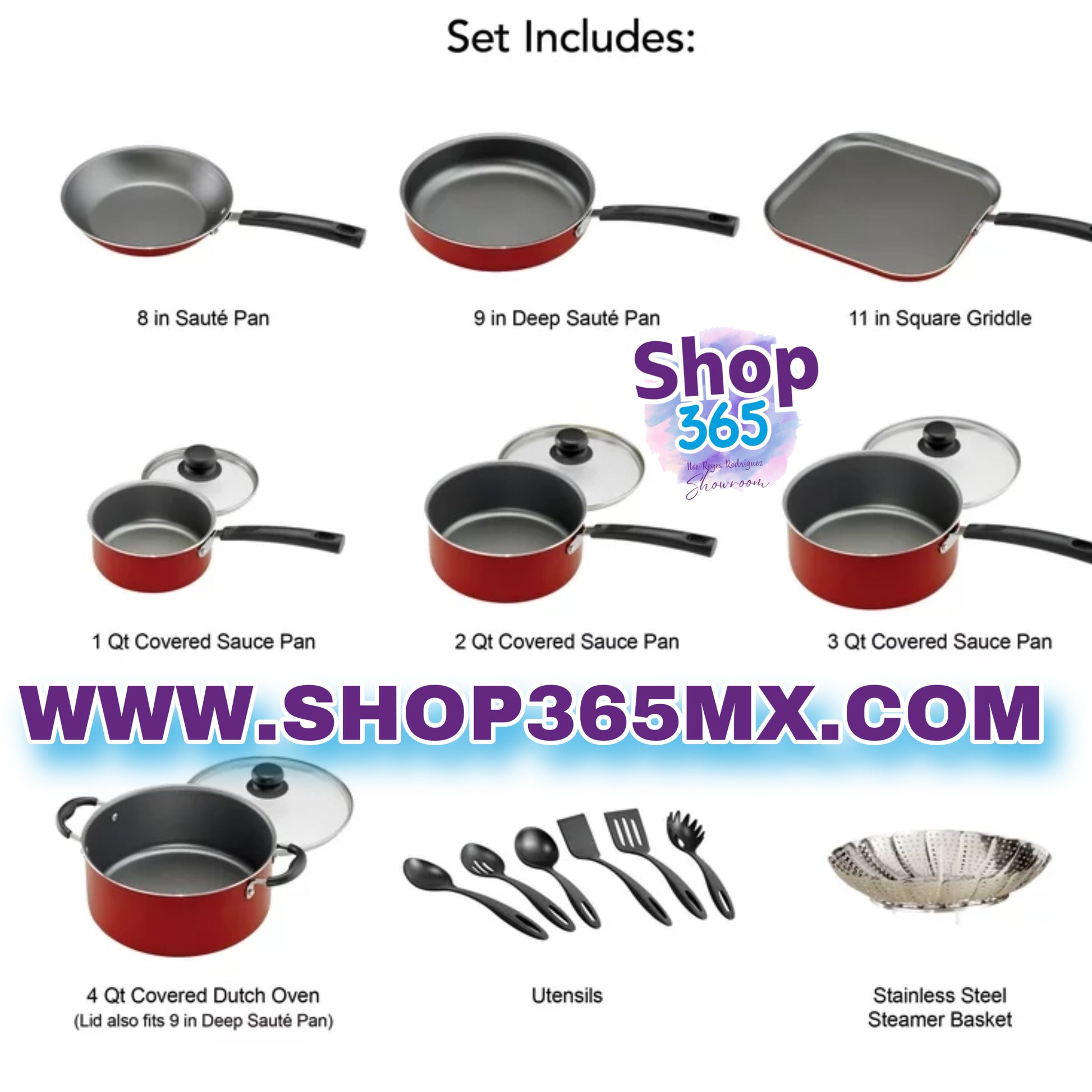 - Sartén para saltear de 8", sartén para saltear de 9" de profundidad, plancha de 11", cacerola con tapa de 1 cuarto, cacerola con tapa de 2 cuartos, cacerola con tapa de 3 cuartos, cacerola de 4 cuartos con tapa (la tapa de 4 cuartos se adapta al modelo de 9" sartén honda), plegable de acero inoxidable para cocinar al vapor, cuchara sólida, espumadera, espátula sólida, espátula ranurada, cuchara para pasta, cucharón