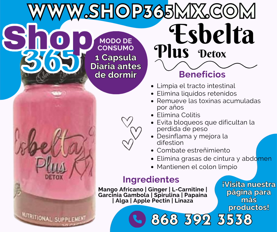 Esbelta Plus Detox es un suplemento alimenticio especialmente formulado para desintoxicar el organismo, eliminar líquidos retenidos y apoyar la pérdida de peso. Gracias a su mezcla de ingredientes naturales, limpia el tracto intestinal, combate el estreñimiento y ayuda a mantener un colon saludable.