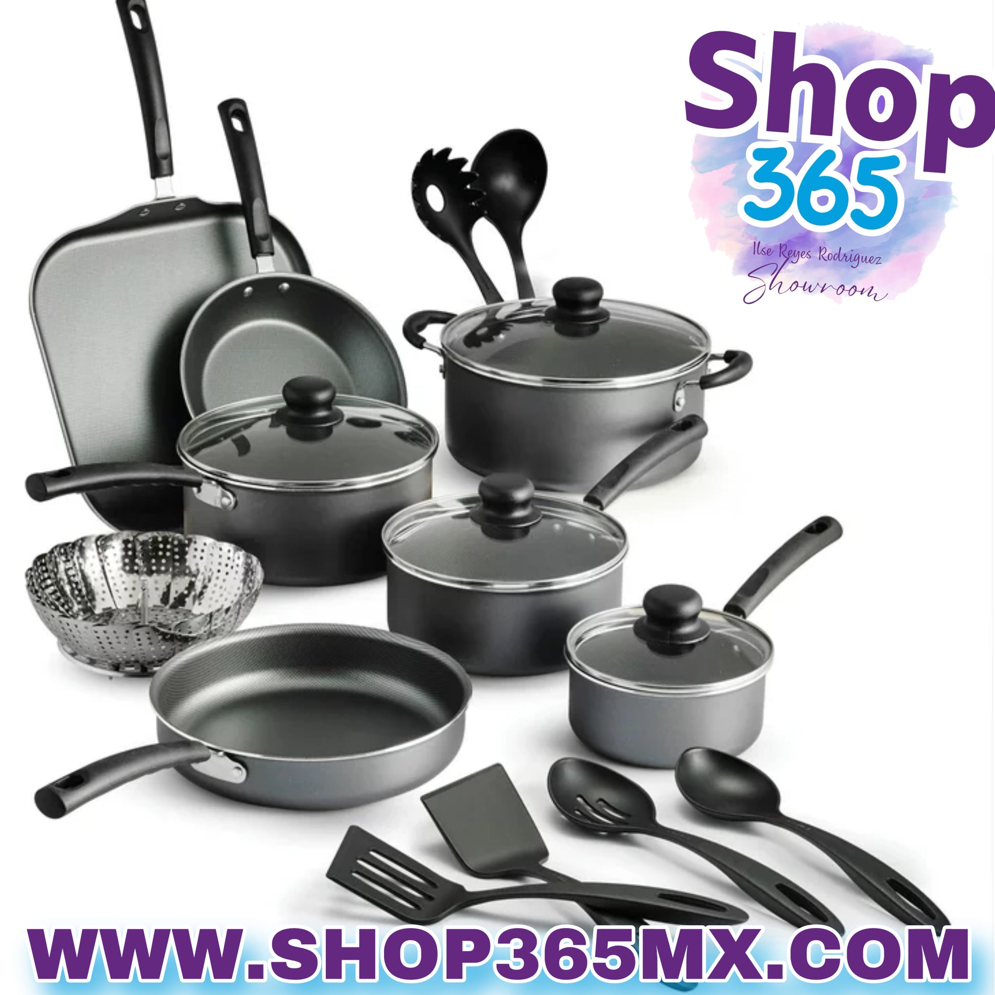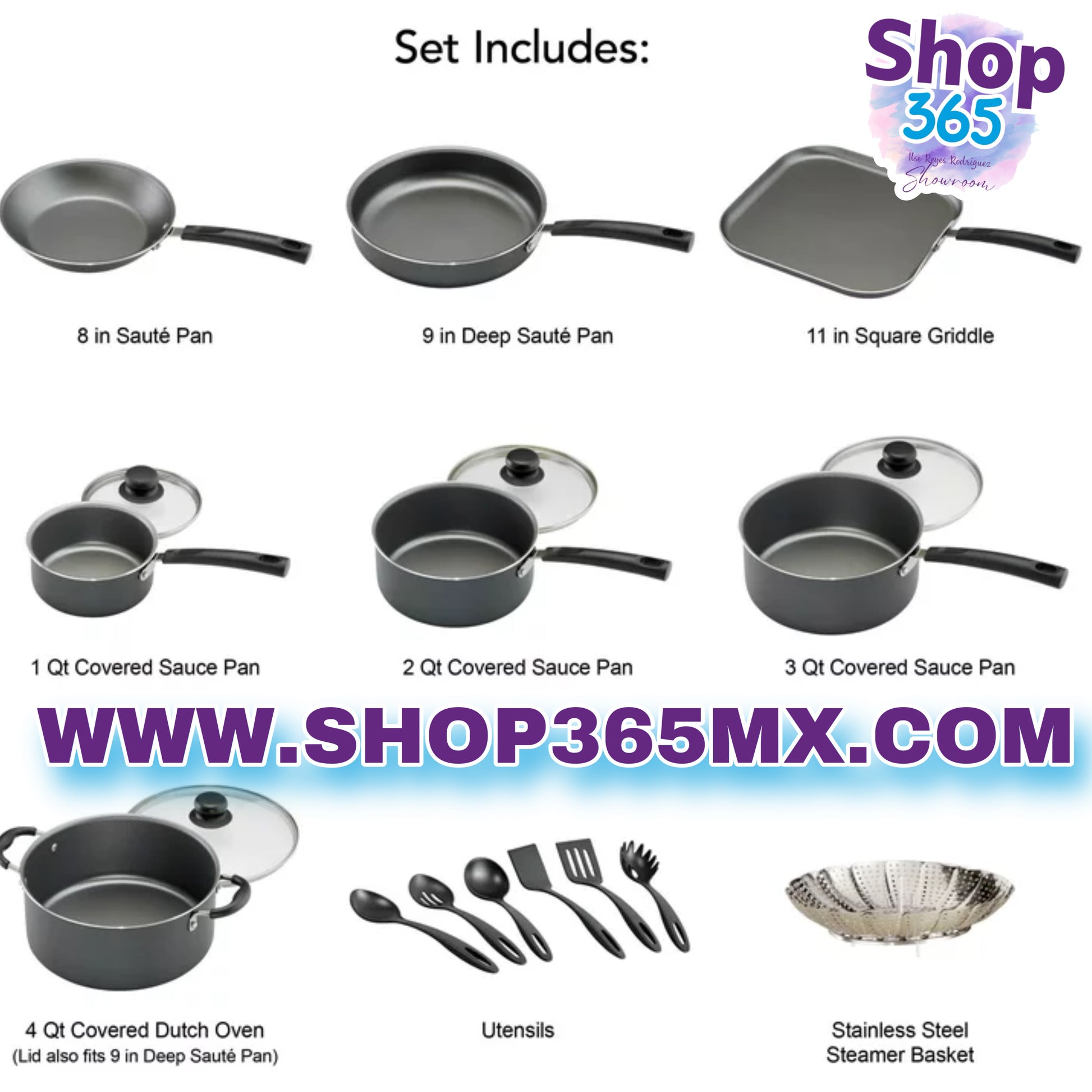 • Sartén para saltear de 8", sartén para saltear de 9" de profundidad, plancha de 11", cacerola con tapa de 1 cuarto, cacerola con tapa de 2 cuartos, cacerola con tapa de 3 cuartos, cacerola de 4 cuartos con tapa (la tapa de 4 cuartos se adapta al modelo de 9" sartén honda), plegable de acero inoxidable para cocinar al vapor, cuchara sólida, espumadera, espátula sólida, espátula ranurada, cuchara para pasta, cucharón