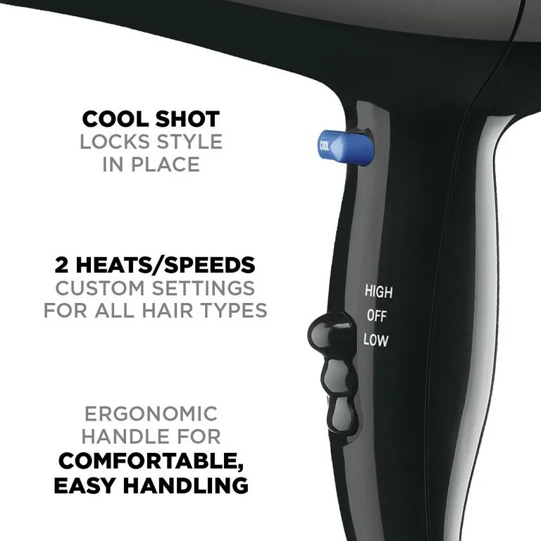 Control de temperatura Bajo: cabello delicado, fino y fácil de alisar Bajo: cabello de promedio a grueso o tratado Alto: cabello grueso u ondulado Cabello difícil de alisar Conceptos básicos de secado 1. Lave y acondicione el cabello con los productos de su elección. Enjuáguese bien. Seque el cabello con una toalla para eliminar el exceso de humedad. Sección de cabello. Usando el secador junto con el cepillo para peinar, dirija el aire caliente a través de una sección de cabello a la vez. Mueva la secadora de manera constante por cada sección para que el aire caliente pase por el cabello. Flujo de aire directo al cabello, no al cuero cabelludo.2. Mantenga las rejillas de entrada de aire de la secadora sin obstrucciones y libres de cabello mientras se seca. 3. Para evitar un secado excesivo, no concentre el calor en ninguna sección durante un período de tiempo prolongado. Mantenga la secadora en movimiento mientras peina. 4. Para retoques rápidos entre champús, humedezca el cabello con un chorro de agua antes de peinarlo con el secador. 5. Cuando utilice su secadora para crear rizos y ondas, seque el cabello casi por completo con una temperatura más cálida y luego termine de peinarlo con la función de disparo frío para cerrar el tallo del cabello y fijar el peinado en su lugar. Secador de cabello de tamaño mediano: Con 1875 vatios de potencia de secado, este secador de cabello simple pero confiable es una herramienta esencial para tus necesidades de peinado, con un diseño liviano y fácil de manejar. Múltiples configuraciones: con 2 configuraciones de calor y 2 velocidades, esta secadora es perfecta para cualquier tipo de cabello, desde fino a grueso, y su mango de diseño ergonómico permite un peinado cómodo. Fácil almacenamiento y manejo: este secador de pelo cuenta con un anillo para colgar y un cable de alimentación de 5 pies para un almacenamiento rápido y fácil cuando no está en uso. No necesita lubricación. Líder en secadores de cabello: desde gorros tradicionales hasta secadores de alta tecnología equipados con tecnología de punta, Conair tiene una gran selección de secadores de cabello para cada tipo de cabello y cada estilo de cabello. Conair Hair Care: Desde 1959, hemos fabricado pequeños electrodomésticos, herramientas para peinar el cabello y más innovadores; Nuestra línea de cuidado del cabello incluye secadores de pelo, cepillos, herramientas de peinado y accesorios para el cabello de alta calidad.