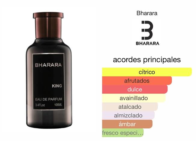 King de Bharara es una fragancia de la familia olfativa Aromática para Hombres. King se lanzó en 2021. Las Notas de Salida son naranja, bergamota y limón (lima ácida); la Nota de Corazón es notas afrutadas; las Notas de Fondo son vainilla, almizcle blanco y ámbar.
