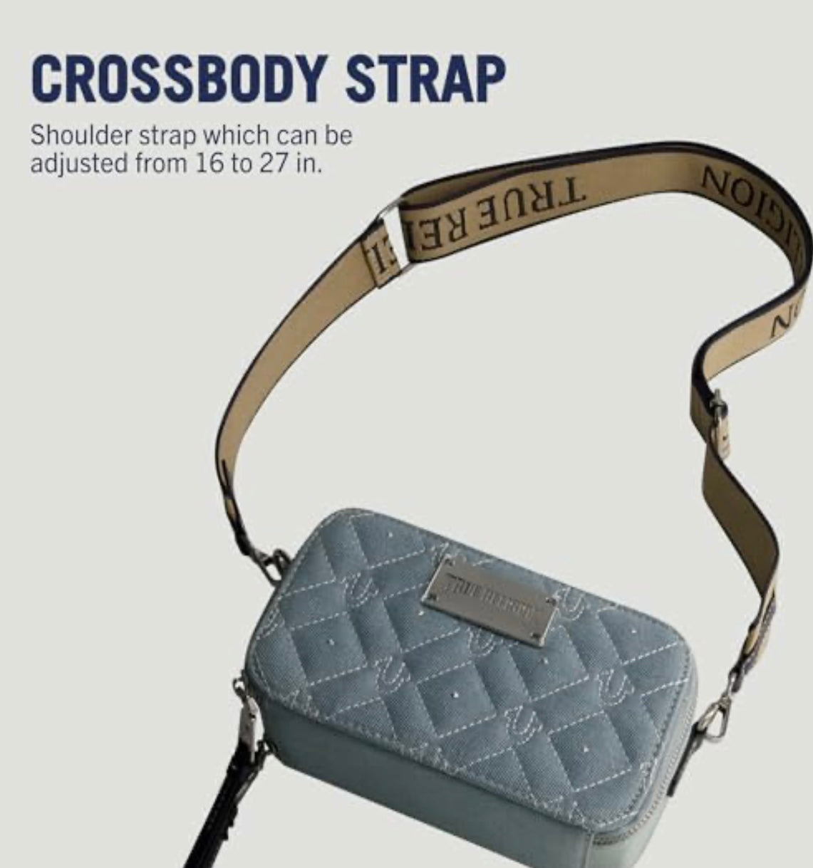 Dale un toque moderno y sofisticado a tu look con esta exclusiva bolsa crossbody True Religion en color mezclilla claro. Su diseño compacto con estampado de la icónica herradura y costuras decorativas le aporta un estilo urbano y elegante al mismo tiempo.