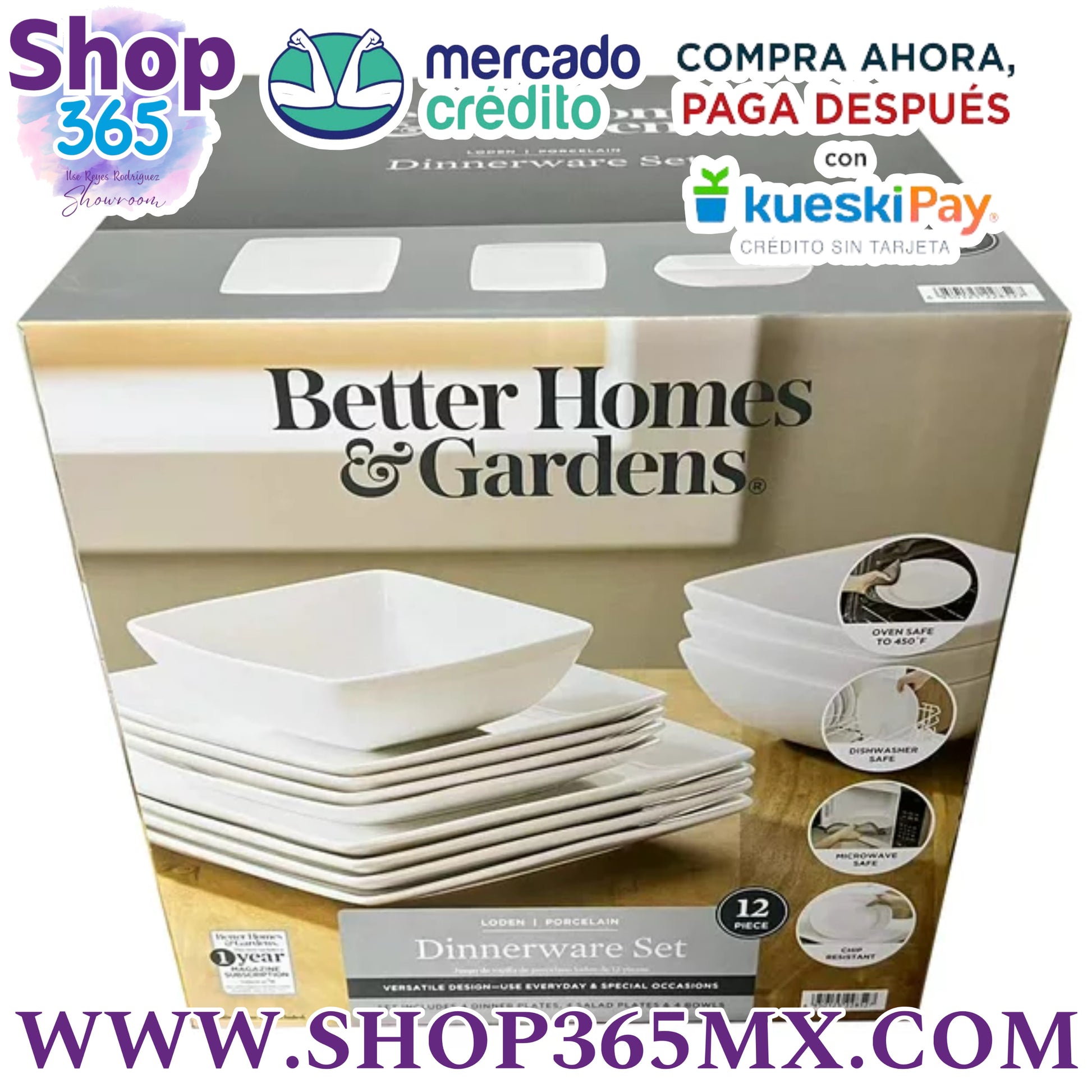Better Homes & Gardens- Conjunto de Vajilla de Porcelana Cuadrada Blanca de 12 Piezas