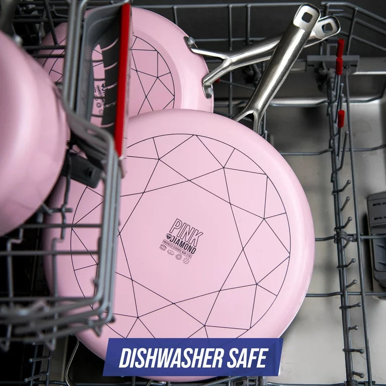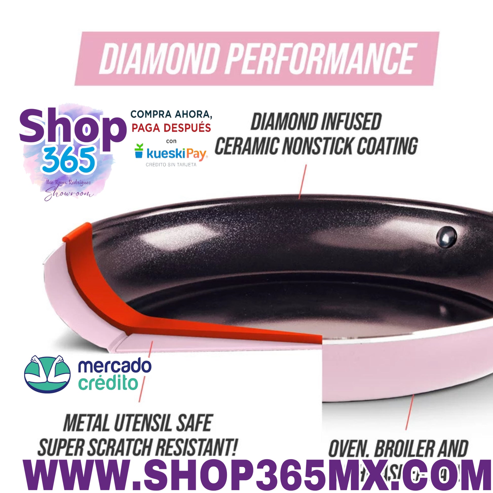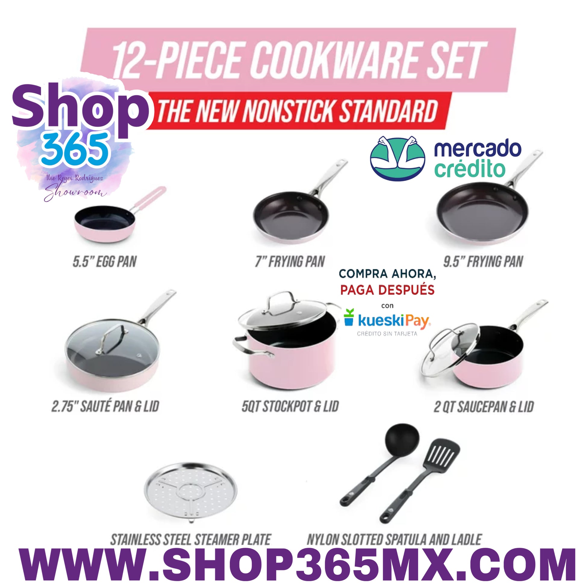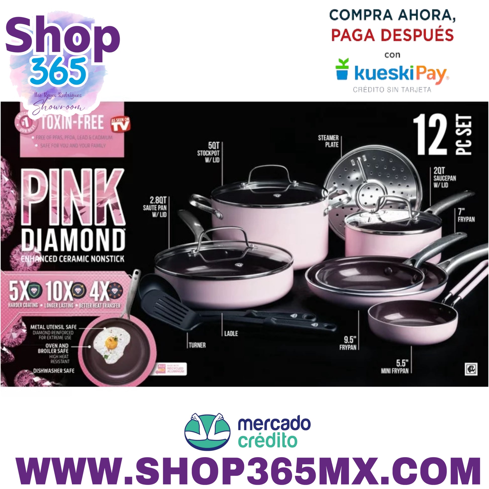 Ya sea que esté instalando una nueva cocina o ampliando su colección, el juego de utensilios de cocina antiadherentes Pink Diamond de 12 piezas incluye todo lo que necesita para crear comidas increíbles, por la mañana, al mediodía y por la noche. El juego incluye: sartenes de 7” y 9.5”, cacerola para huevos de 5.5”, cacerola de 2 cuartos con tapa, sartén para saltear de 2.75 cuartos con tapa, olla sopera de 5 cuartos con tapa, placa vaporera de acero inoxidable, espátula ranurada de nailon y cucharón. Descubra un antiadherente que puede soportar el calor (hasta 600 °F) con una superficie resistente a rayones que resiste los utensilios de metal. Fabricados en aluminio, los utensilios de cocina Pink Diamond se calientan rápida y uniformemente para obtener resultados excepcionales en todo momento. Te encantará cómo la exclusiva cerámica antiadherente con infusión de diamantes se libera sin esfuerzo, para que puedas cocinar sin exceso de aceite. Las tapas de vidrio transparente le permiten controlar los alimentos sin liberar calor ni humedad. Además, el revestimiento antiadherente libre de toxinas no contiene PFAS, PFOA, plomo ni cadmio, por lo que es seguro para usted y el medio ambiente. Con bases forjadas de alta resistencia para evitar deformaciones y mangos de acero inoxidable remachados, estos utensilios de cocina ultraduraderos duran 10 veces más que los antiadherentes tradicionales y están respaldados por una garantía limitada de por vida. Límpielo rápidamente con un poco de agua y jabón o simplemente métalo en el lavavajillas. Apto para horno y parrilla hasta 600°F, tapas de vidrio hasta 425°F. Compatible con todas las cocinas, excepto inducción. ¿El juego incluye 7? y 9? sartenes, cacerola de 2 cuartos con tapa, salteado de 2,75 cuartos? sartén con tapa, olla de 5 cuartos con tapa y dos utensilios de cocina multiusos de nailon negro La exclusiva cerámica antiadherente con infusión de diamantes es 5 veces más dura, dura 10 veces más y transfiere el calor 4 veces más rápido que el antiadherente tradicional. Las superficies antiadherentes se liberan sin esfuerzo y resisten rayones; son seguras para utensilios de metal. Cocine sin preocupaciones sin PFAS, PFOA, plomo ni cadmio. Las tapas de vidrio transparente le permiten controlar los alimentos sin liberar calor ni humedad. Cómodos mangos de acero inoxidable, remachados a la sartén para mayor durabilidad. Aptas para el lavavajillas; Apto para horno y parrilla hasta 600 °F, tapas de vidrio hasta 425 °F