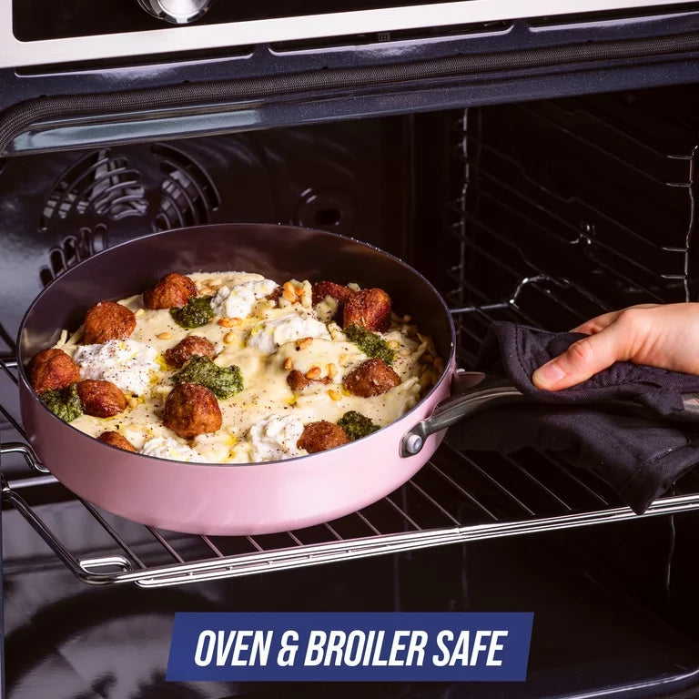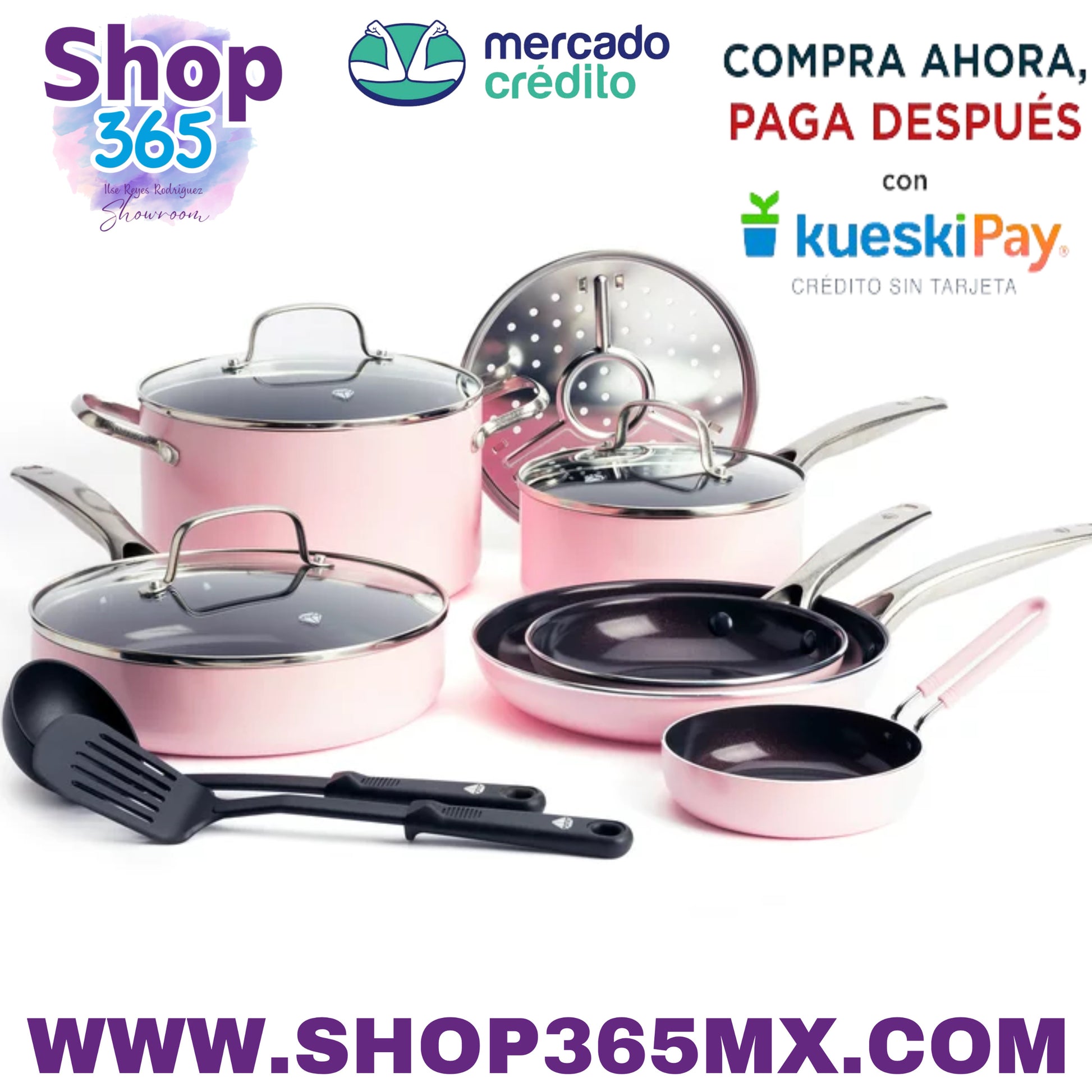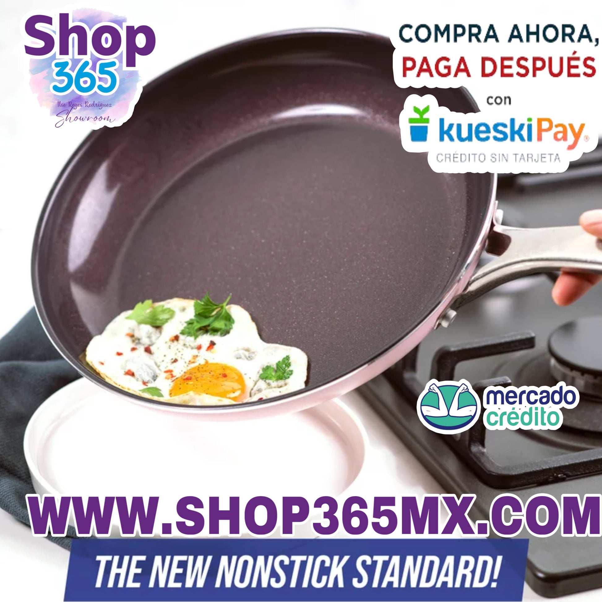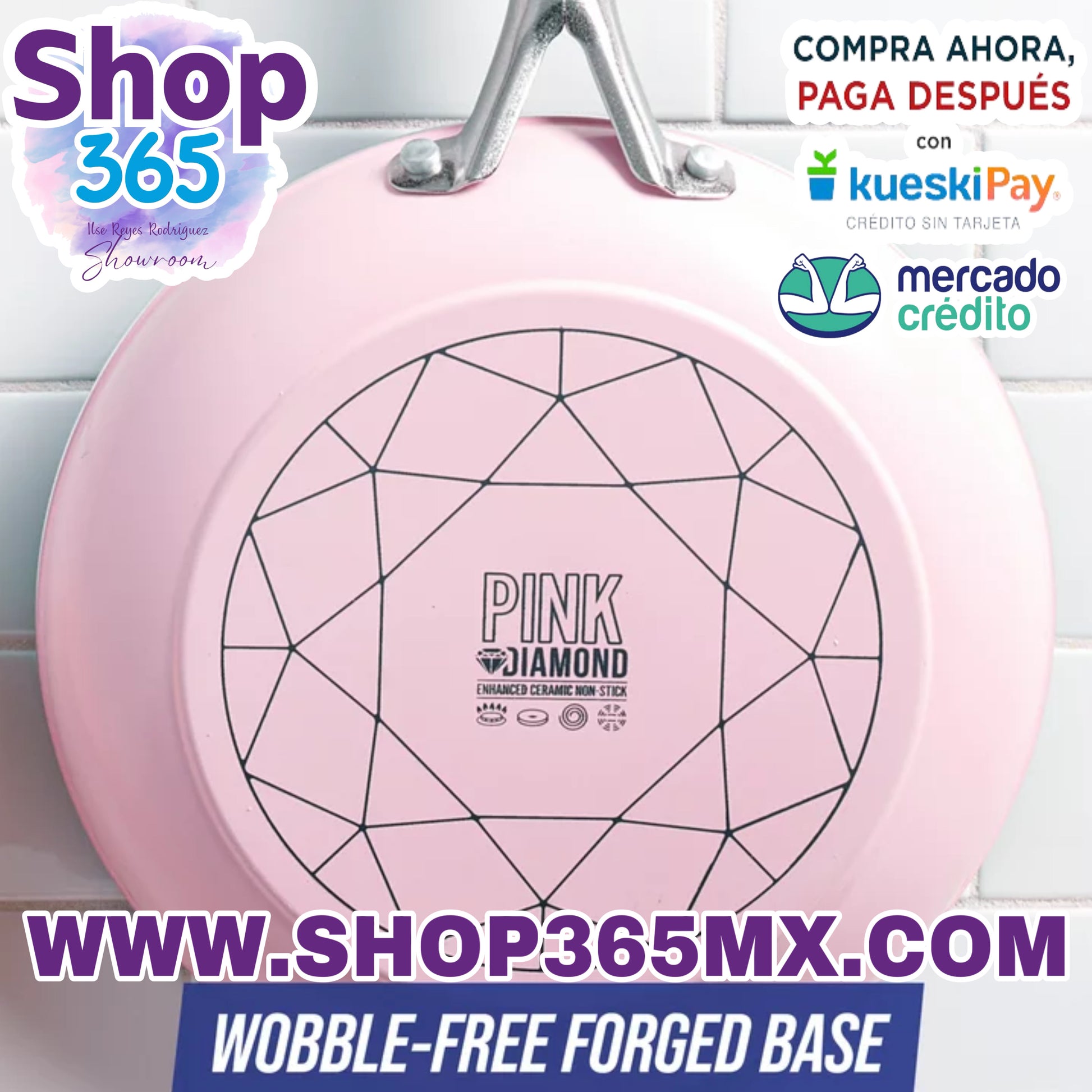 Ya sea que esté instalando una nueva cocina o ampliando su colección, el juego de utensilios de cocina antiadherentes Pink Diamond de 12 piezas incluye todo lo que necesita para crear comidas increíbles, por la mañana, al mediodía y por la noche. El juego incluye: sartenes de 7” y 9.5”, cacerola para huevos de 5.5”, cacerola de 2 cuartos con tapa, sartén para saltear de 2.75 cuartos con tapa, olla sopera de 5 cuartos con tapa, placa vaporera de acero inoxidable, espátula ranurada de nailon y cucharón. Descubra un antiadherente que puede soportar el calor (hasta 600 °F) con una superficie resistente a rayones que resiste los utensilios de metal. Fabricados en aluminio, los utensilios de cocina Pink Diamond se calientan rápida y uniformemente para obtener resultados excepcionales en todo momento. Te encantará cómo la exclusiva cerámica antiadherente con infusión de diamantes se libera sin esfuerzo, para que puedas cocinar sin exceso de aceite. Las tapas de vidrio transparente le permiten controlar los alimentos sin liberar calor ni humedad. Además, el revestimiento antiadherente libre de toxinas no contiene PFAS, PFOA, plomo ni cadmio, por lo que es seguro para usted y el medio ambiente. Con bases forjadas de alta resistencia para evitar deformaciones y mangos de acero inoxidable remachados, estos utensilios de cocina ultraduraderos duran 10 veces más que los antiadherentes tradicionales y están respaldados por una garantía limitada de por vida. Límpielo rápidamente con un poco de agua y jabón o simplemente métalo en el lavavajillas. Apto para horno y parrilla hasta 600°F, tapas de vidrio hasta 425°F. Compatible con todas las cocinas, excepto inducción. ¿El juego incluye 7? y 9? sartenes, cacerola de 2 cuartos con tapa, salteado de 2,75 cuartos? sartén con tapa, olla de 5 cuartos con tapa y dos utensilios de cocina multiusos de nailon negro La exclusiva cerámica antiadherente con infusión de diamantes es 5 veces más dura, dura 10 veces más y transfiere el calor 4 veces más rápido que el antiadherente tradicional. Las superficies antiadherentes se liberan sin esfuerzo y resisten rayones; son seguras para utensilios de metal. Cocine sin preocupaciones sin PFAS, PFOA, plomo ni cadmio. Las tapas de vidrio transparente le permiten controlar los alimentos sin liberar calor ni humedad. Cómodos mangos de acero inoxidable, remachados a la sartén para mayor durabilidad. Aptas para el lavavajillas; Apto para horno y parrilla hasta 600 °F, tapas de vidrio hasta 425 °F