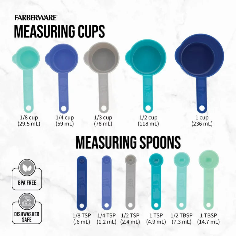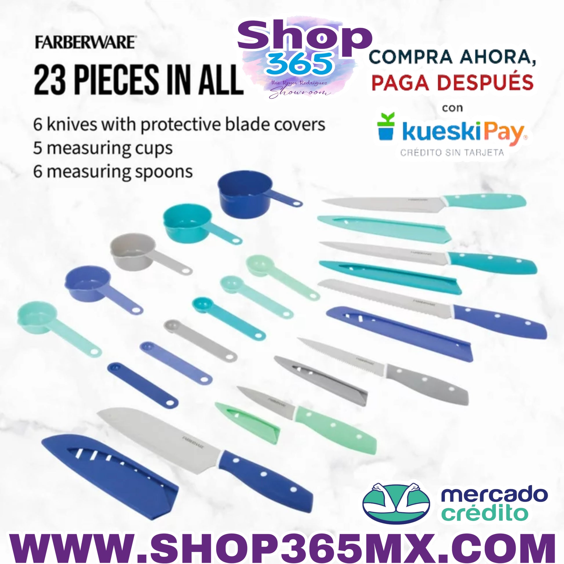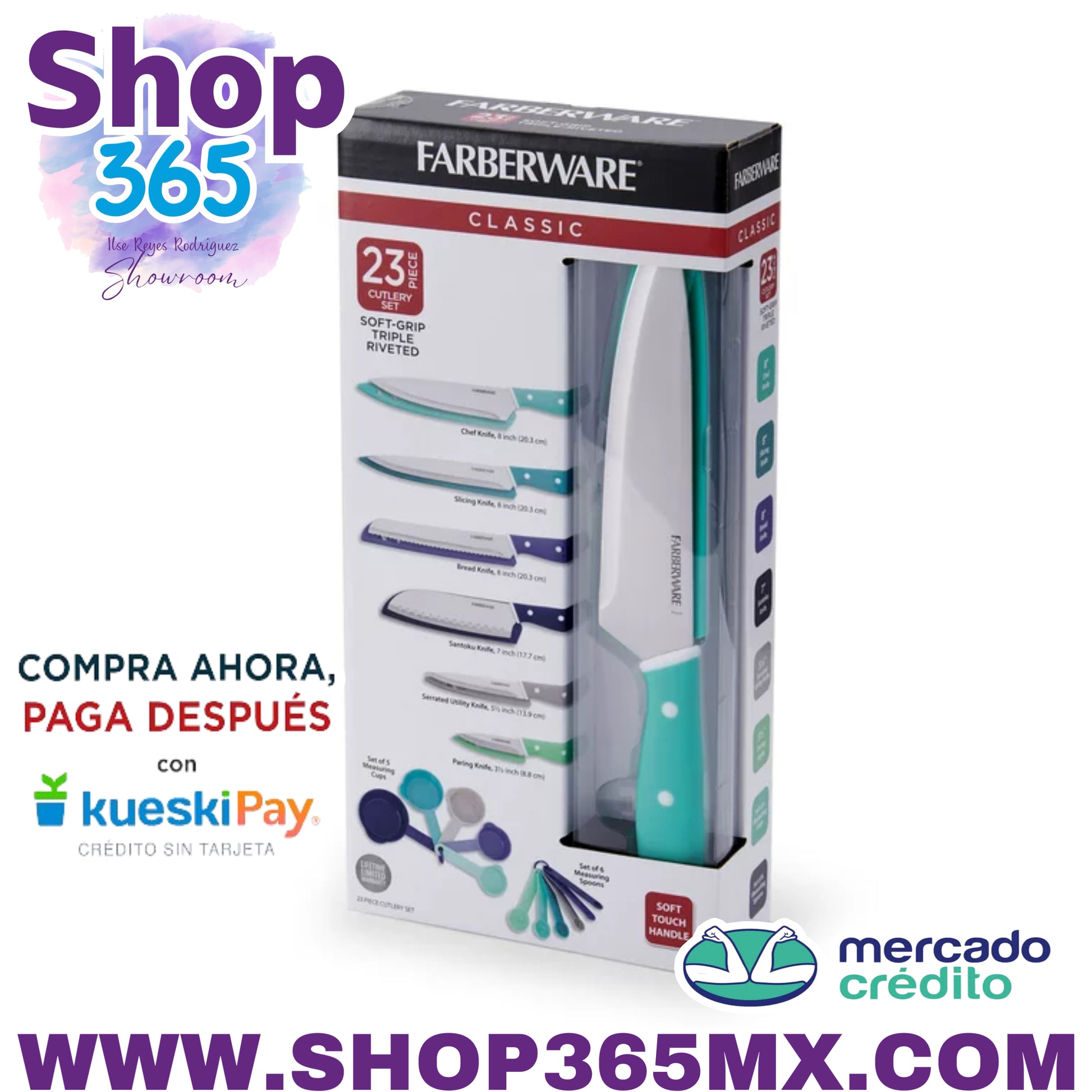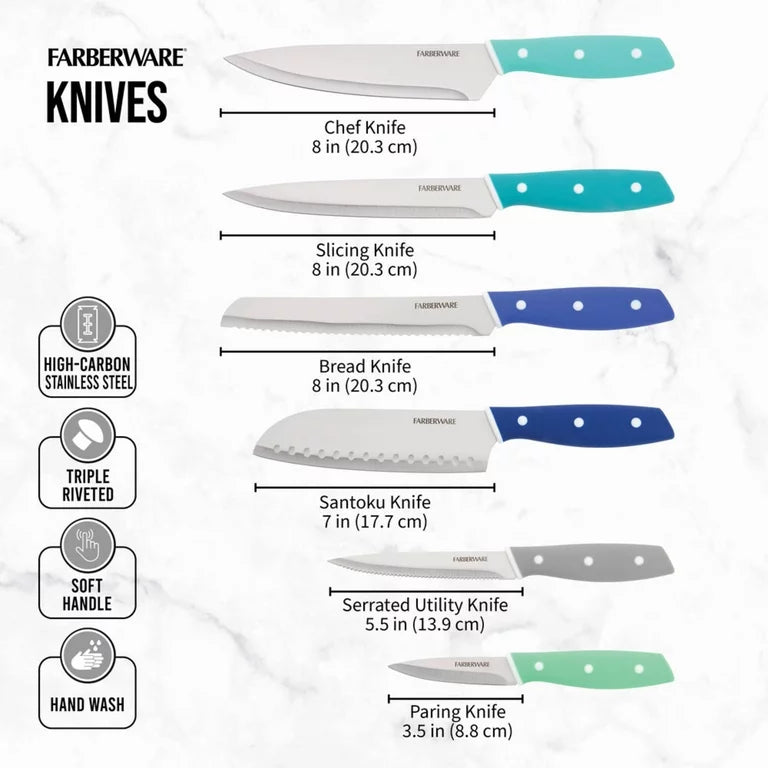 Este juego de cubiertos y utensilios de 23 piezas de Farberware le brinda todo lo necesario para las tareas diarias de preparación de alimentos. Las cuchillas afiladas de acero inoxidable con alto contenido de carbono cortan con una precisión superior, mientras que los mangos ergonómicos con triple remachado brindan comodidad y control óptimos. Las cubiertas de las hojas protegen los cuchillos y garantizan la seguridad en los cajones, y las tazas y cucharas medidoras se encajan para un fácil almacenamiento. El juego incluye: un cuchillo de chef de 8 pulgadas, un cuchillo para rebanar de 8 pulgadas, un cuchillo para pan de 8 pulgadas, un cuchillo Santoku de 7 pulgadas, un cuchillo dentado de 5,5 pulgadas, un cuchillo pelador de 3,5 pulgadas, 6 fundas para cuchillos, 5 tazas medidoras y 6 cucharas medidoras. Lavar a mano únicamente. Garantía limitada de por vida. EL JUEGO DE 23 PIEZAS INCLUYE: Chef de 8 pulgadas con cubierta para cuchillas; cuchillo rebanador de 8 pulgadas con cubierta para la hoja; cuchillo para pan de 8 pulgadas con funda para la hoja; cuchillo Santoku de 7 pulgadas con cubierta de hoja; cuchillo multiusos dentado de 5,5 pulgadas con cubierta de hoja; Cuchillo pelador de 3,5 pulgadas con hoja cóncava AFILADO: las hojas de acero inoxidable con alto contenido de carbono cortan con una precisión superior; Las cubiertas de las hojas protegen los cuchillos y garantizan la seguridad en los cajones. DISEÑO ERGONÓMICO: los mangos de agarre suave con triple remachado brindan comodidad y control óptimos CONVENIENTE: el juego le brinda todas las necesidades para la preparación diaria de alimentos; nido para tazas y cucharas medidoras para un almacenamiento compacto CUIDADO FÁCIL: para obtener mejores resultados, lave a mano y seque inmediatamente