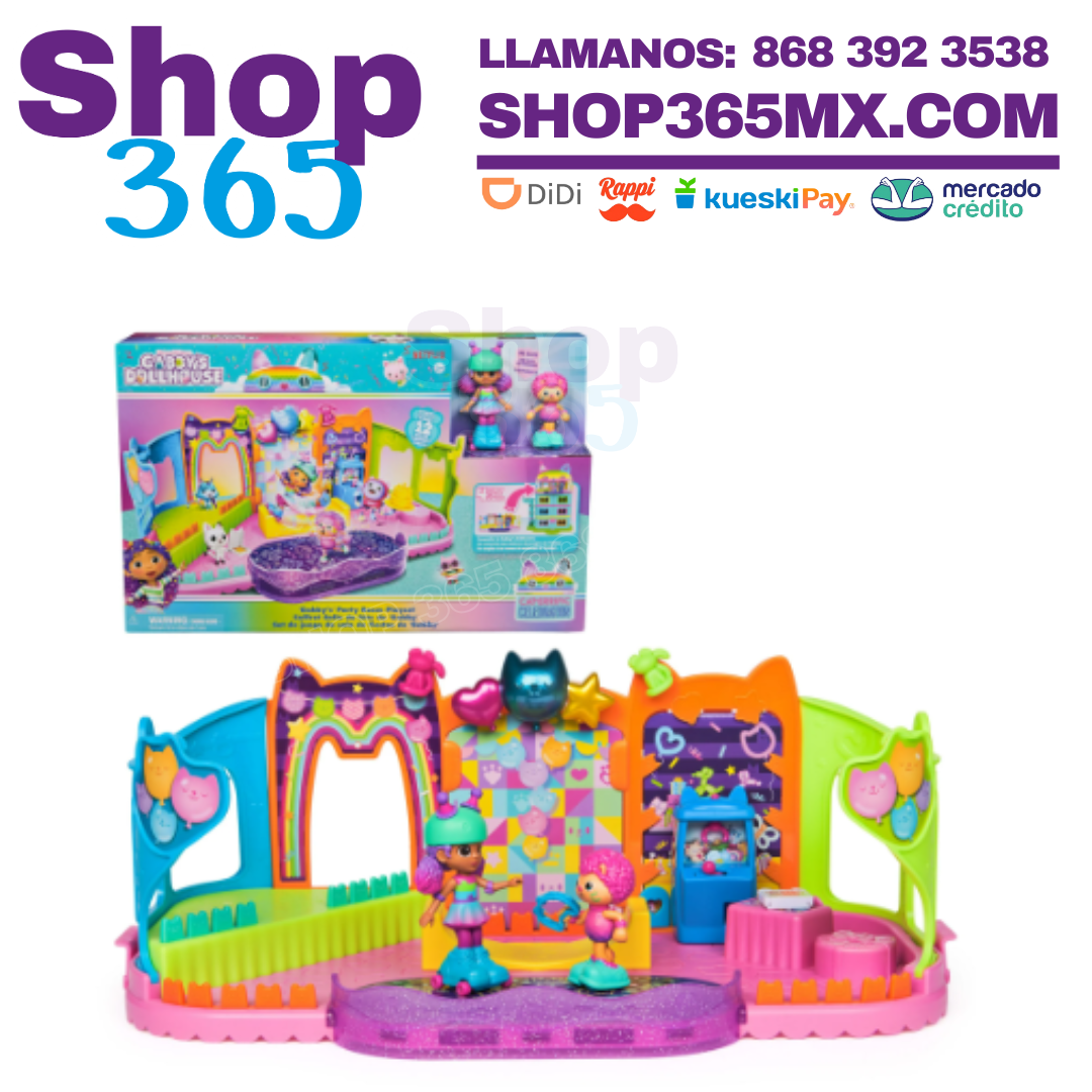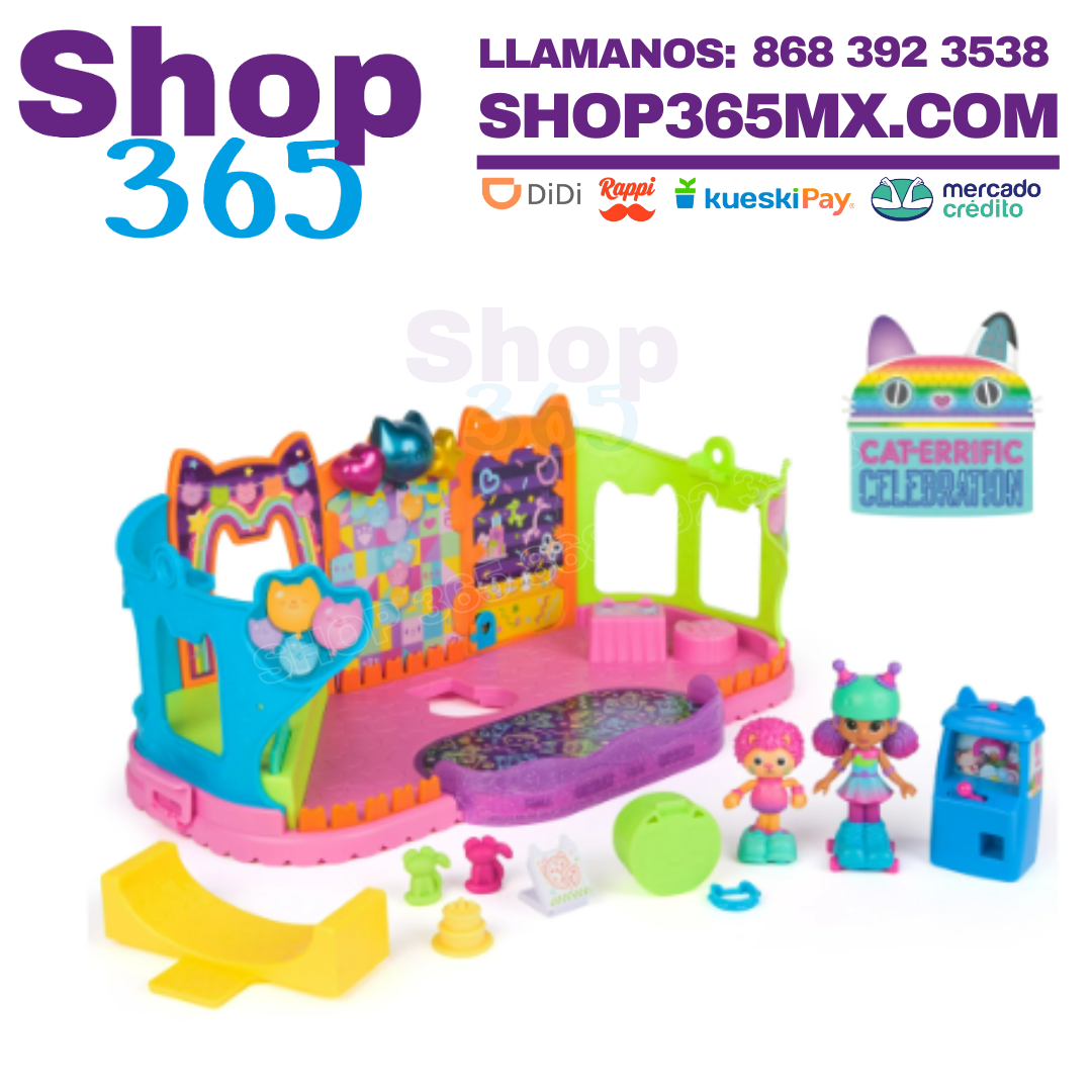 - Sala de juegos y SKATE PARK: Gabby’S Party Room cuenta con una rampa de skate, escenario y pista de patinaje! Cuenta con lindos accesorios como una máquina de garras, y el patinador Gabby y Marty el gato de fiesta figuras con patines de trabajo!