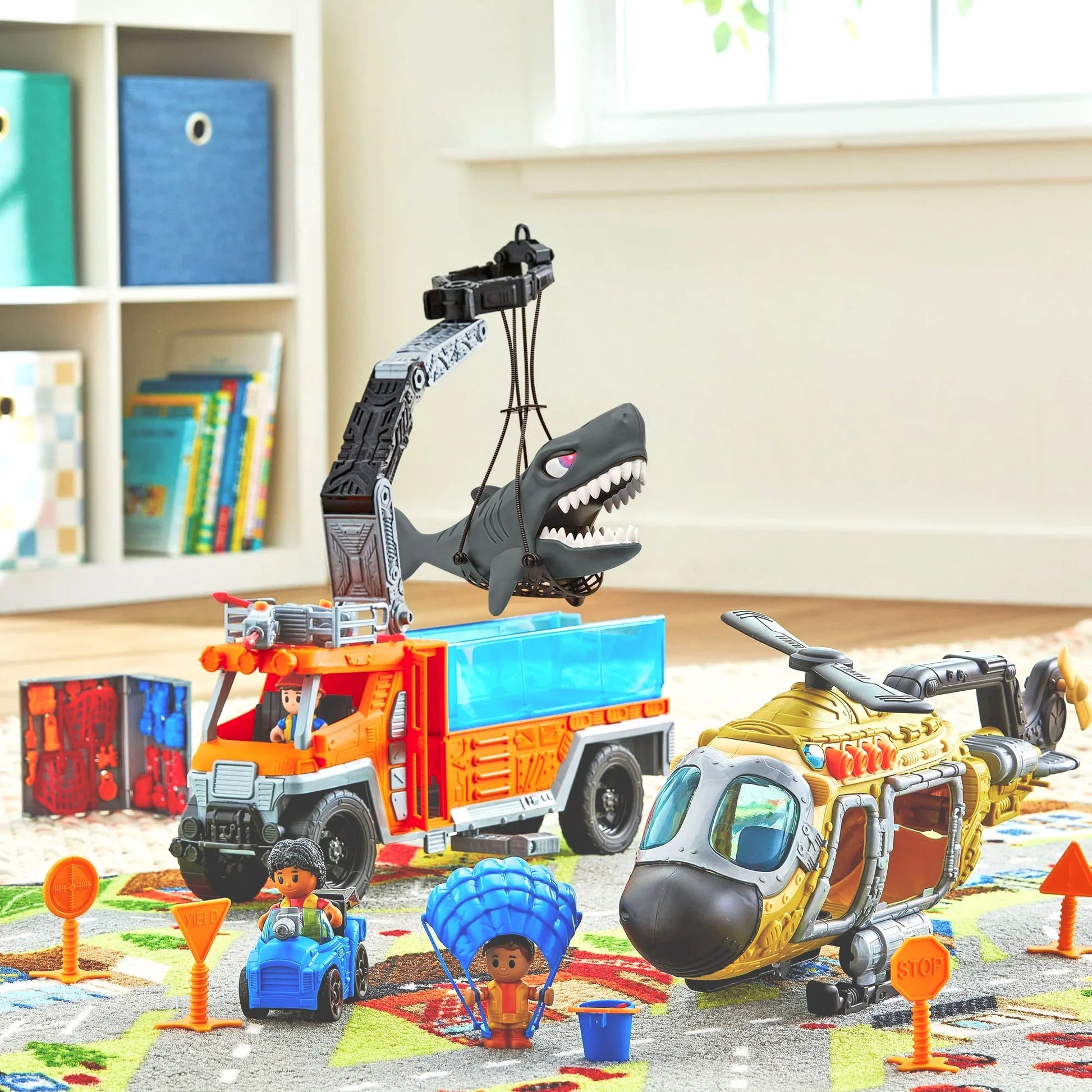 - El conjunto incluye figuras de acción, señales, peces y equipo de exploración