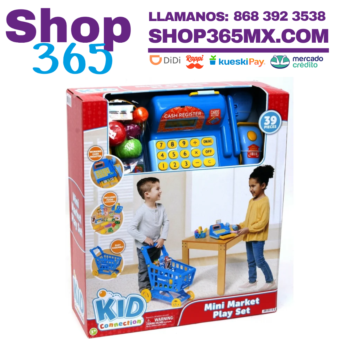 - Juego completo de 39 piezas: incluye una caja registradora, carrito de compras, cesta, dinero ficticio, comida y accesorios