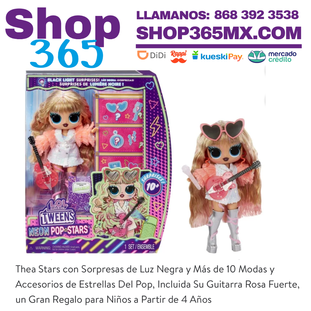 Estoy en Entre hacer armonías y deslumbrantes movimientos de baile; ¡los paparazzi siempre quieren atrapar mi estilo! ¡Mira el mundo, porque nosotros los preadolescentes brillamos NEON y ponemos un GLOW en el escenario! Prepara tu cámara y hace algo de ruido como el nuevo L.O.L. Sorpresa Tweens Neon Pop Stars Fashion Doll, Thea Stars, sube al escenario! ¡Descubre lo que hay dentro con una estrella del pop que brilla más que el resto mientras toca su guitarra! Cuando llega la luz negra, Thea Stars revela sorpresas épicas, inspirando creatividad y juego imaginativo. Vestida con la icónica moda de las estrellas del pop, con su chaqueta iridiscente y secuenciada con mangas de borla rosa NEON y su brillante mono de pasta de plata, ¡siempre se roba el espectáculo! Usando su linterna UV personal, revelar sorpresas NEON como sus modas, accesorios, y el pelo realmente GLOW con el estilo estrella pop más fresco! Unbox todos sus accesorios increíbles, como sus botas metálicas de plata hasta la rodilla, joyas de zapatos twirly, gafas de sol en forma de corazón, aretes de neón garabatos, bolso de plata globo, peine, linterna UV, micrófono para armonizar, y rockin'guitarra de neón rosa para que pueda rasguear todos los acordes! Articulado para un montón de poses divertidas, con cabello rubio y rosa ondulado, ¡el peinado nunca ha sido más divertido! Recoger tanto deslumbrante L.O.L. Neon Pop Star Fashion Dolls: Kitty K y Thea Stars para crear el POP DUO más icónico para subir al escenario. L.O.L. Muñecas de moda sorpresa con el pelo elegante, trajes y muchas piezas de accesorios detallados hacen un juguete perfecto para los niños, incluyendo 4 años de edad y hasta para el juego imaginario fingir! Como regalos para cualquier ocasión especial, las muñecas proporcionan horas de juego social con hermanos y amigos. De MGA Entertainment, creadores de L.O.L. Muñecas de moda y coleccionables sorpresa, muñecas Rainbow HighTM, muñecas Na Na Surprise, muñecas de moda Bratz, MGA's Dream EllaTM, MGA's Glitter BabyzTM, LalaloopsyTM, muñecas y coleccionables Baby Born Surprise, juguetes para niños Little Tikes y muchas otras marcas favoritas.