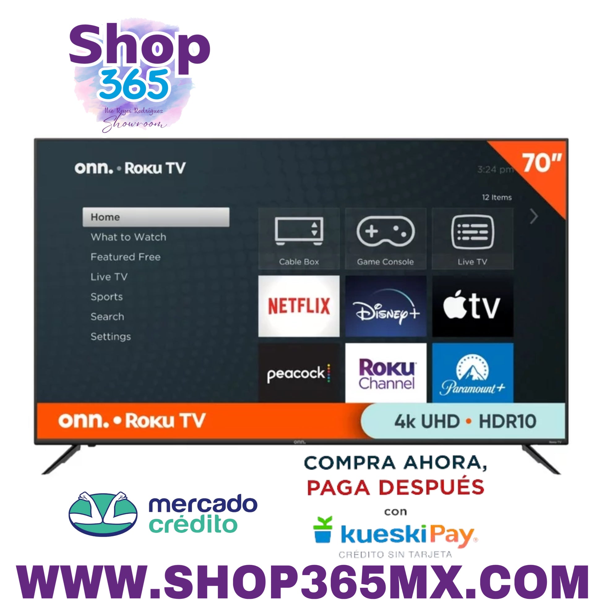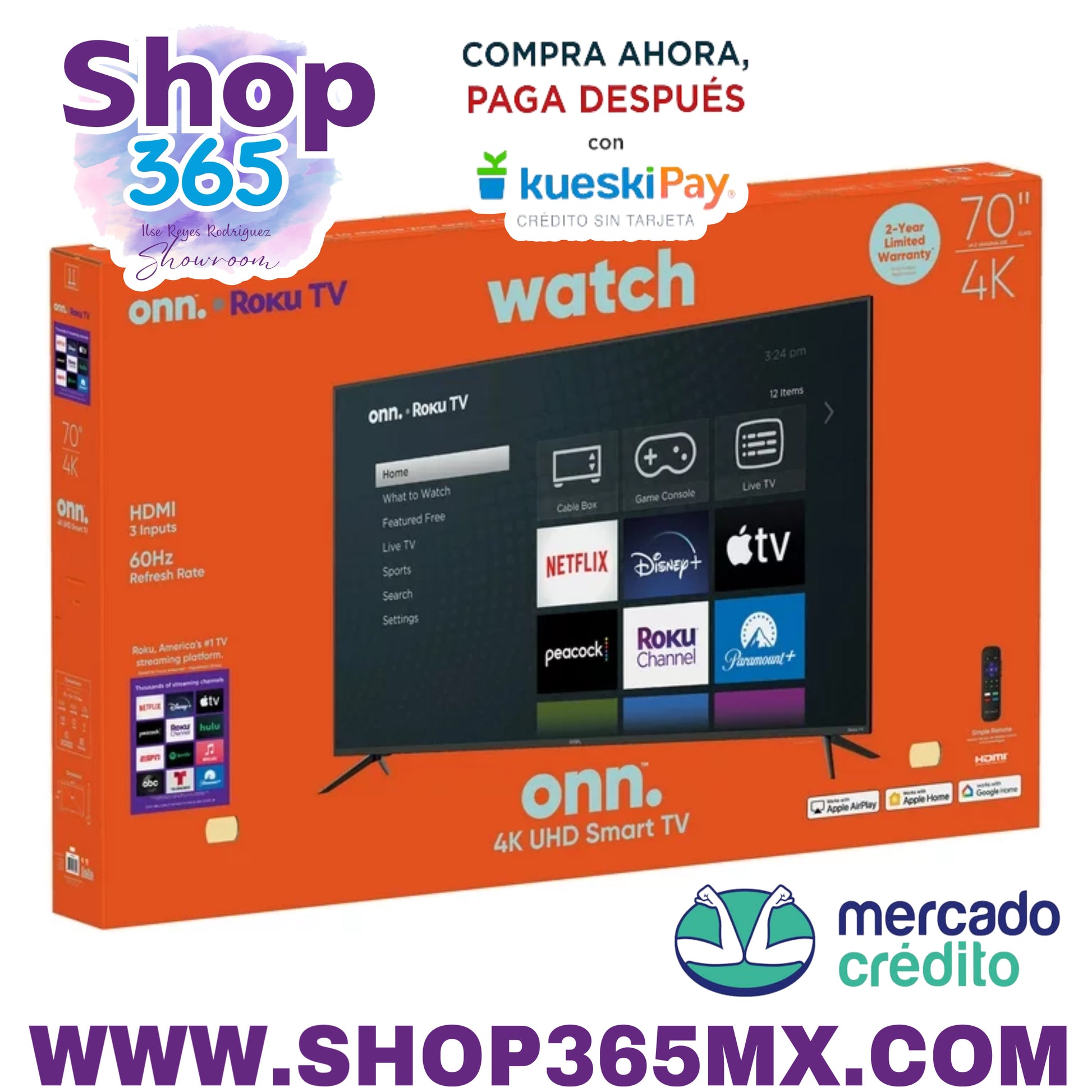 ¡Disfruta de películas y episodios de televisión, noticias, deportes, música y más! Insistimos en la Ultra Alta Definición 4K para este televisor LED de 70”, logrando colores, texturas y detalles más realistas que nunca. También nos asociamos con Roku para brindarte el mejor contenido posible con miles de canales para elegir, presentados convenientemente a través de tu propia pantalla de inicio personalizable. Mire por cable, satélite, antena HDTV o simplemente comience a transmitir desde su aplicación favorita. Como el sonido de tu propia voz. Puedes usarlo con la aplicación móvil de Roku para buscar un título, artista, actor o director, o simplemente volver a la vieja escuela con nuestro práctico control remoto. También manejamos todas las actualizaciones de software de forma automática, por lo que lo único de lo que tienes que preocuparte es de qué mirar. Piérdete en la mejor experiencia visual. Mira con nuestro onn. Smart TV 4K UHD de 70". Estamos en algo aquí. Eliminamos la molestia de comprar productos electrónicos y creamos una marca fresca y simple. Con deliciosos toques de color, encontrar el producto adecuado nunca ha sido tan fácil. Di adiós hasta la toma de decisiones estresantes y el miedo al pasillo de la electrónica. Nuestra misión es simple... ofrecer excelentes productos y hacerlo fácil. Elija y vuelva a usar su capacidad intelectual para las cosas importantes de la vida, como reflexionar sobre la pregunta: "¿Qué deberíamos hacer?". ¿Miro compulsivamente este fin de semana?" Televisor LED UHD de 70" (69,5" en diagonal real) 2160p Resolución 4K (2160p): imagen nítida que resalta colores, texturas y detalles más realistas Roku Smart TV: transmita de forma inalámbrica más de 500 000 películas y episodios de TV disponibles en miles de canales gratuitos o pagos, presentados convenientemente a través de su propia pantalla de inicio personalizable Aplicación móvil gratuita: ¿no encuentras tu control remoto? Utilice la aplicación móvil Roku en su teléfono inteligente para buscar canales o controlar por voz Listo para el hogar inteligente: funciona con Apple Home, Amazon Alexa y Google Home Frecuencia de actualización de 60 Hz: movimiento suave mientras juegas o miras deportes Compatible con soporte VESA: 400 x 200 mm Conexiones: 3 HDMI, 1 compuesto, 1 USB, 1 LAN, 1 coaxial/cable, 1 óptico y 1 de auriculares ¿Qué hay en la caja? 1 onn. Roku TV 70”, 1 control remoto Roku TV (baterías incluidas), 1 Guía de inicio rápido y 1 soporte para TV + hardware