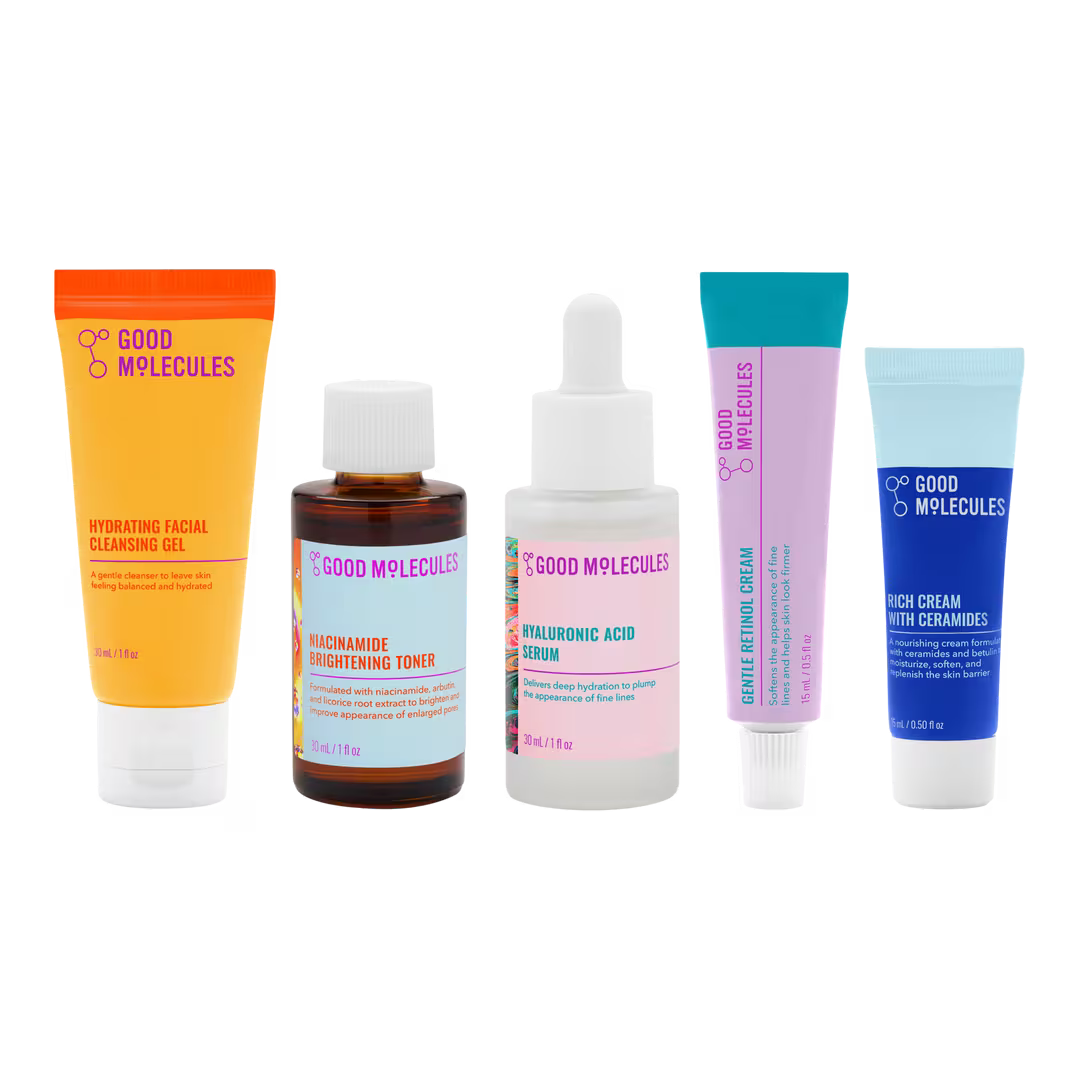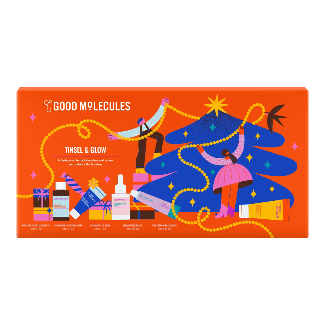 Tinsel & Glow Holiday Set es un set de 5 piezas para hidratar, iluminar y renovar tu piel para las fiestas de Good Molecules.