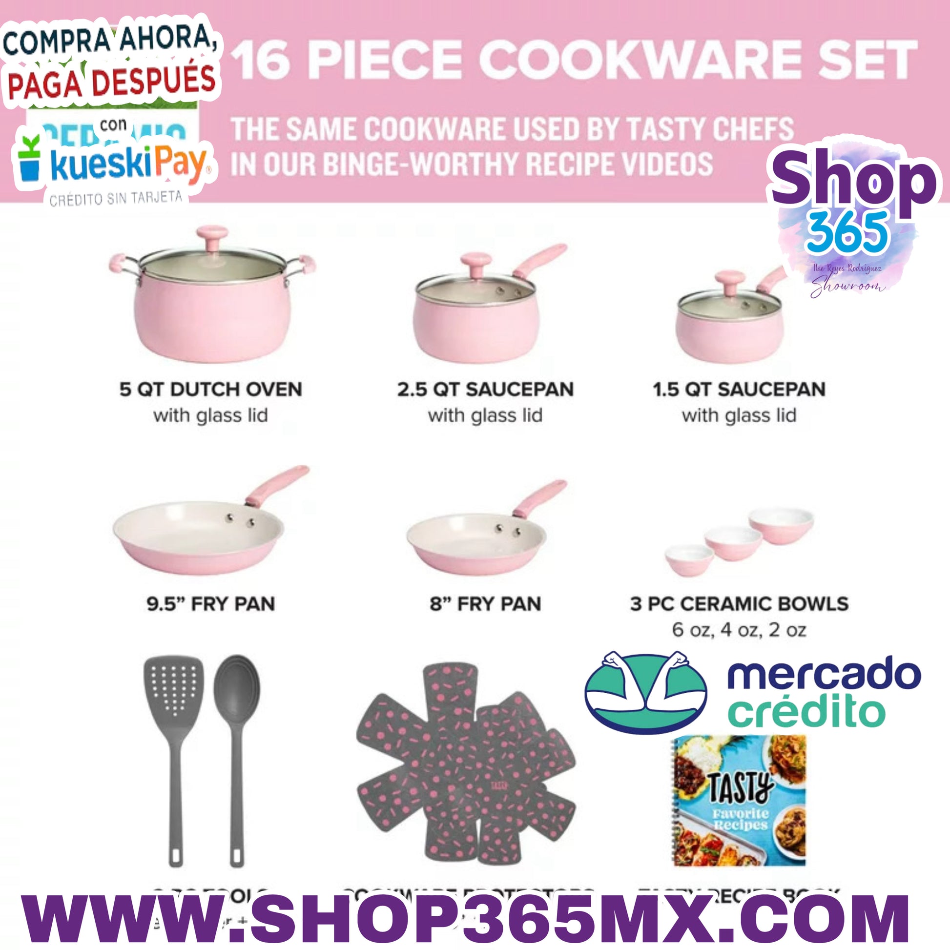 Tasty Clean Ceramic Juego de utensilios de cocina de aluminio antiadherentes de 16 piezas, color rosa