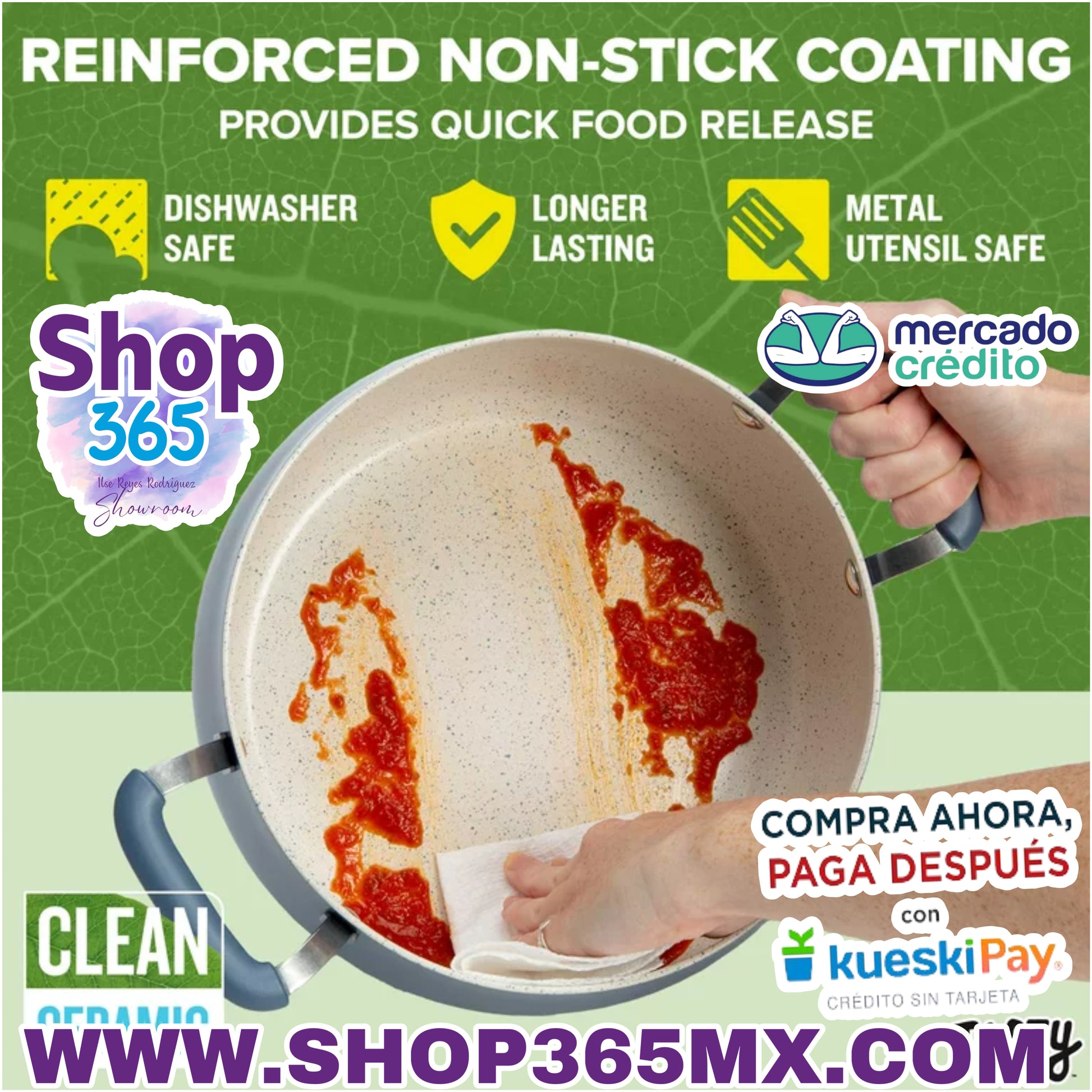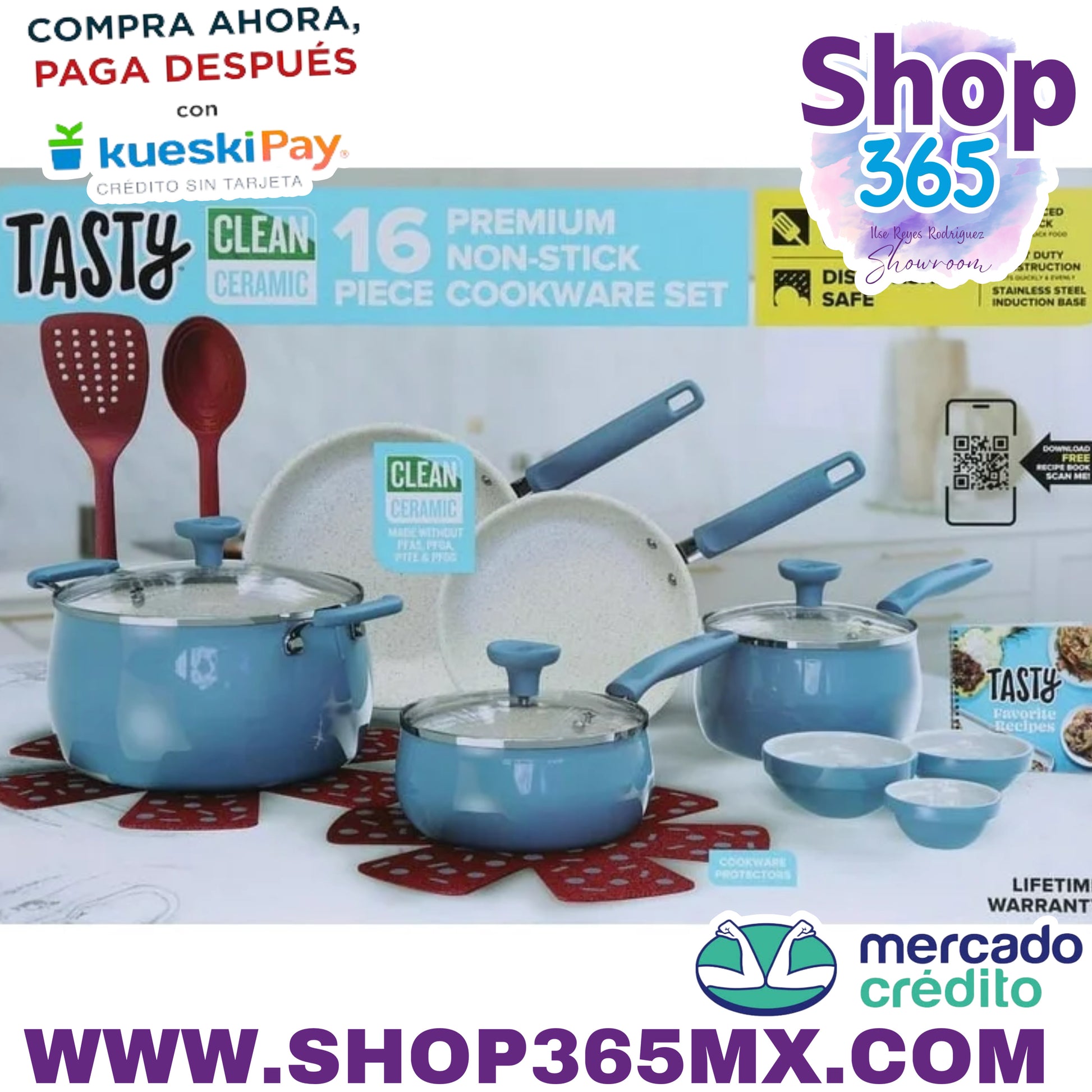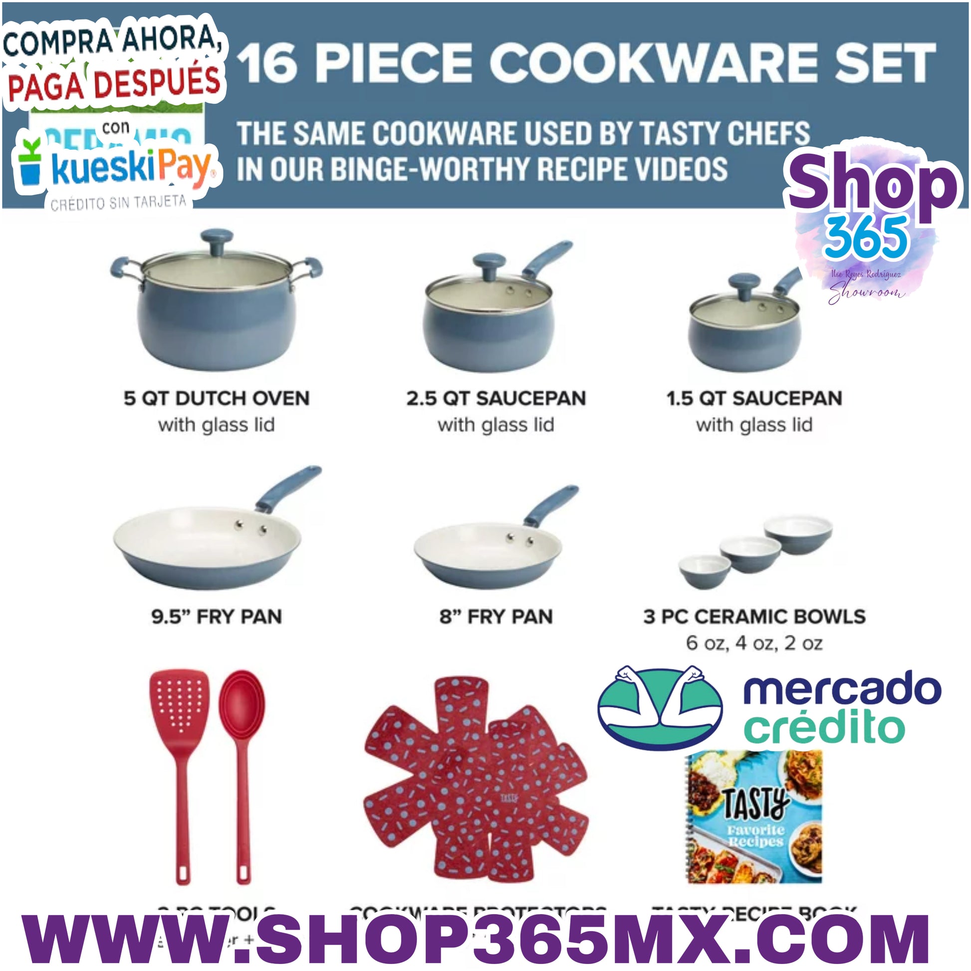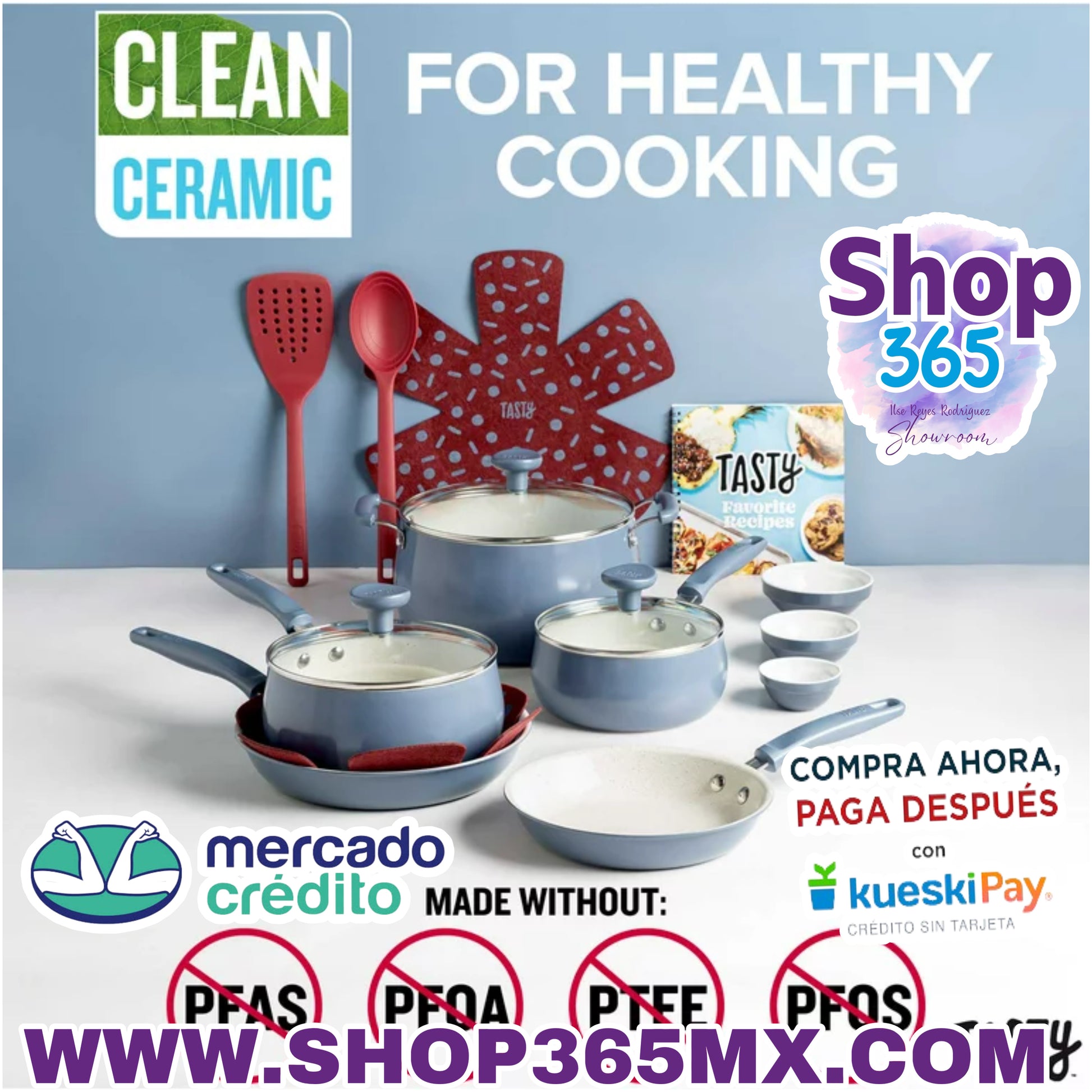 Todo lo que necesitas para tu cocina en una sola caja! Prepare su cocina para el éxito con este juego de utensilios de cocina antiadherentes de 16 piezas Tasty Clean Ceramic. El revestimiento antiadherente Clean Ceramic reforzado, mejor, más resistente y duradero, permite que los alimentos se deslicen fácilmente fuera de la sartén. El revestimiento antiadherente está fabricado sin PFAS, PFOA, PTFE ni PFOS para una cocina saludable. Cuando desee guardar estas ollas y sartenes, utilice los protectores de sartenes incluidos para colocarlos entre dos piezas de utensilios de cocina y permitir apilarlos y almacenarlos sin rayarlos. Los utensilios de cocina también cuentan con una base de inducción de acero inoxidable, lo que los hace adecuados para todas las superficies de cocción, incluidas las de inducción, eléctricas, de gas y de vidrio. Antiadherente mejor, más fuerte y más duradero: este juego de ollas y sartenes cuenta con un revestimiento antiadherente Clean Ceramic reforzado de primera calidad que permite que los alimentos se deslicen fácilmente fuera de la sartén. Cocina Saludable: El revestimiento antiadherente cerámico está fabricado sin PFAS, PFOA, PTFE y PFOS Seguro para utensilios de metal: el duradero antiadherente es seguro para utensilios de metal, aunque recomendamos usar herramientas de silicona, madera o nailon al cocinar. Apto para lavavajillas para una fácil limpieza: estas sartenes son tan fáciles de limpiar como de usar y son aptas para lavavajillas para una limpieza rápida y sencilla. Calidad impresionante: la construcción resistente de este utensilio de cocina se calienta rápida y uniformemente Adecuado para todas las superficies de cocción: ¡Utilice estos utensilios de cocina en inducción, electricidad, gas y vidrio! Las ollas y sartenes cuentan con una base de inducción de acero inoxidable. Una pizca de esto: use los tazones de cerámica incluidos para medir previamente los ingredientes y preparar salsas con anticipación para que cocinar sea muy fácil; viene en tamaños de 6 onzas, 4 onzas y 2 onzas. Las herramientas adecuadas para el trabajo: el volteador y la cuchara son resistentes al calor y seguros para usar en superficies antiadherentes. Apilar y proteger: los protectores de utensilios de cocina incluidos (11,5 pulgadas y 13,5 pulgadas) son perfectos para apilar y almacenar utensilios de cocina sin preocuparse por los rayones. Incluye: sartén de 8 pulgadas, sartén de 9,5 pulgadas, cacerola de 1,5 cuartos con tapa de vidrio, cacerola de 2,5 cuartos con tapa de vidrio, horno holandés de 5 cuartos con tapa de vidrio, 2 protectores para utensilios de cocina (11,5 pulgadas y 13,5 pulgadas), cuchara sólida, ranurada volteador, tazones de preparación de cerámica de 3 piezas (6 onzas, 4 onzas y 2 onzas)