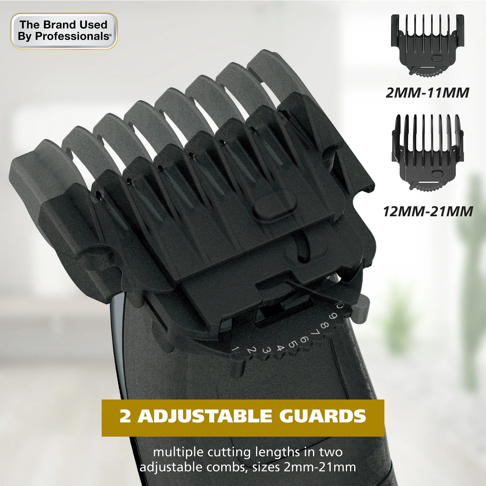 • Cuchilla extra ancha para un recorte masculino sin enganches con protectores ajustables para un aseo seguro